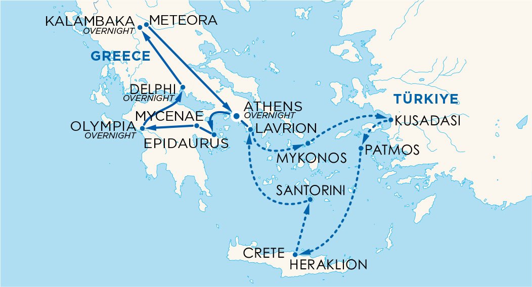 • Day 2 | Athens: Morning tour of Athens. Pass by the Prime Minister’s residence, Constitution Square, the Template of Olympian Zeus, and the Parliament. Stop at the Panathenaic Stadium, site of the first modern Olympic Games. Visit the spectacular Acropolis with its Parthenon and then, visit the Acropolis Museum. Overnight in Athens.